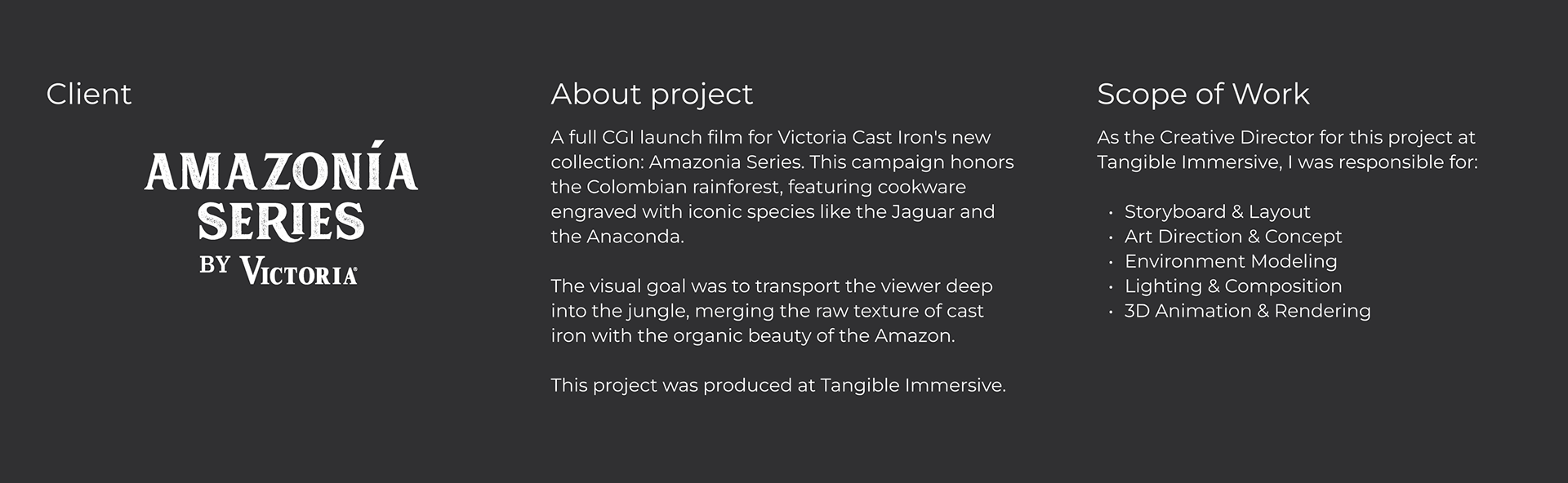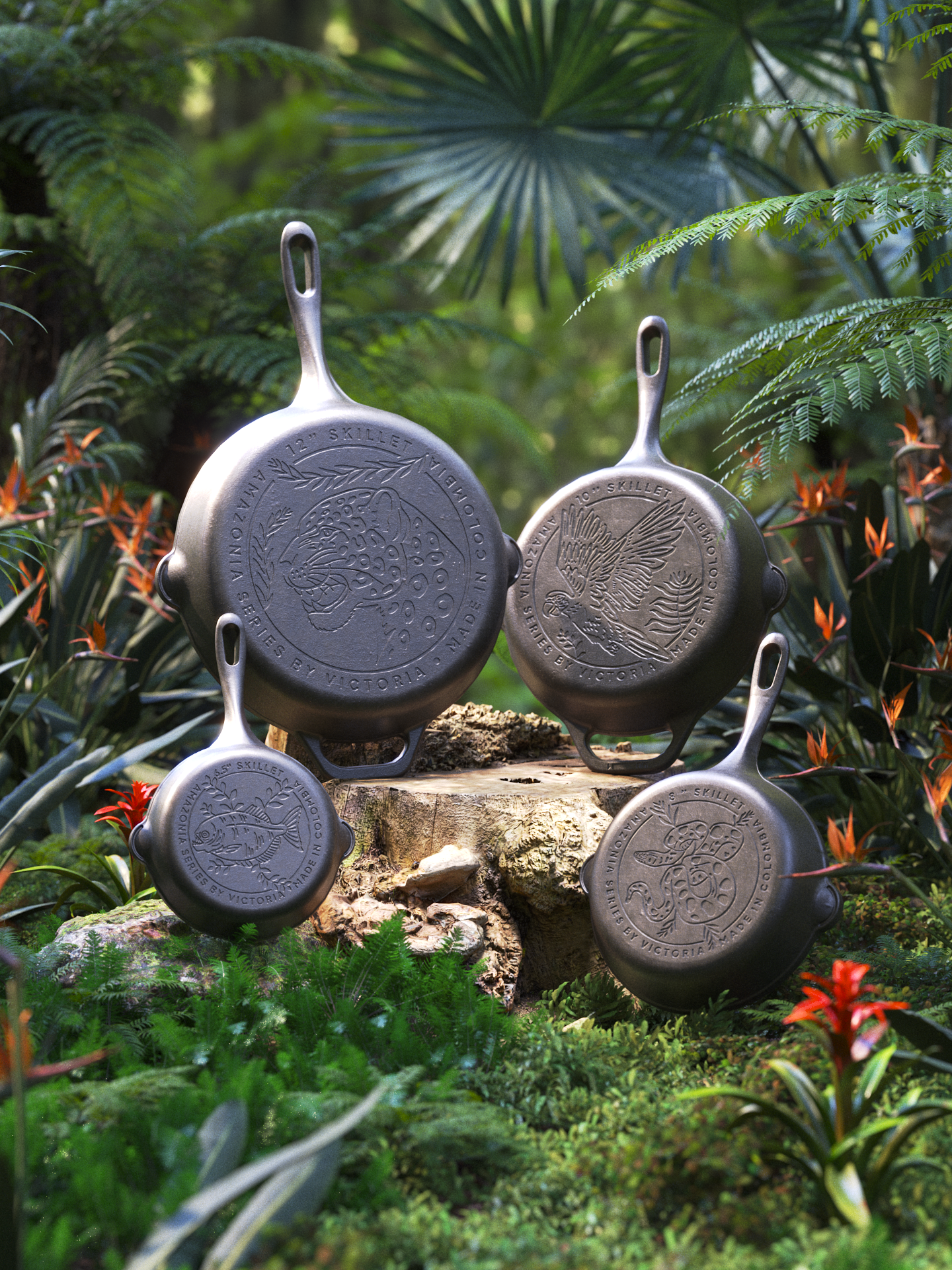 A full CGI launch film for Victoria Cast Iron's new collection: Amazonia Series. This campaign honors the Colombian rainforest, featuring cookware engraved with iconic species like the Jaguar and the Anaconda. The visual goal was to transport the viewer deep into the jungle, merging the raw texture of cast iron with the organic beauty of the Amazon.